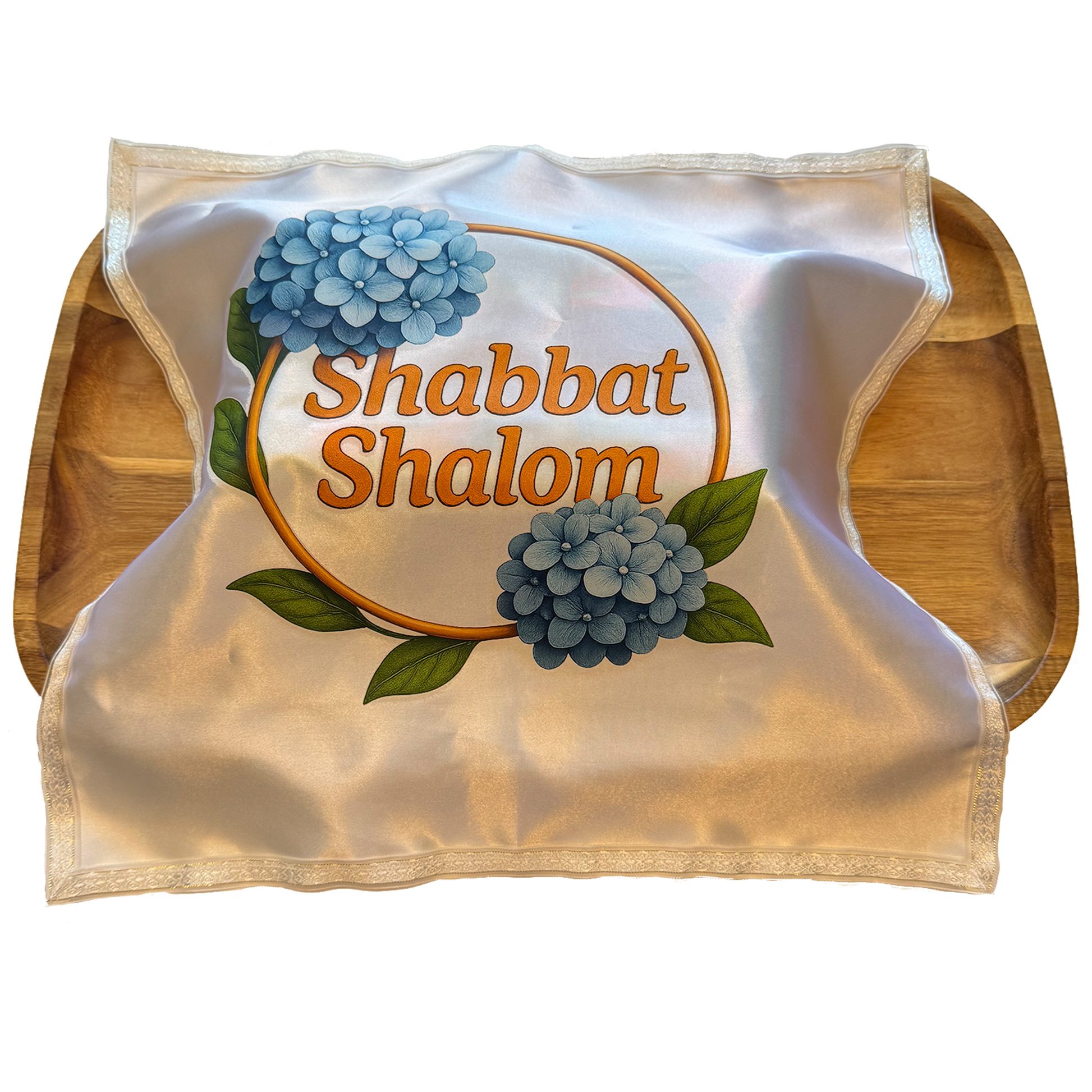 Elegant Satin Challah Cover with Lace Trim – “Shabbat Shalom” Hydrangeas Design – Colorful Printed Jewish Table Decor